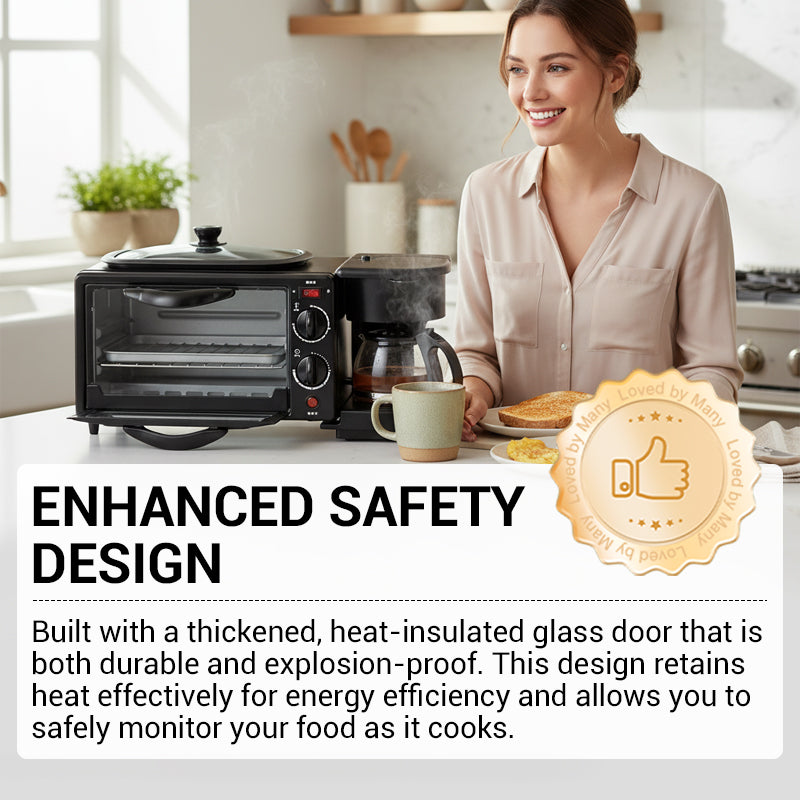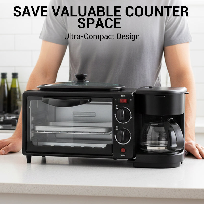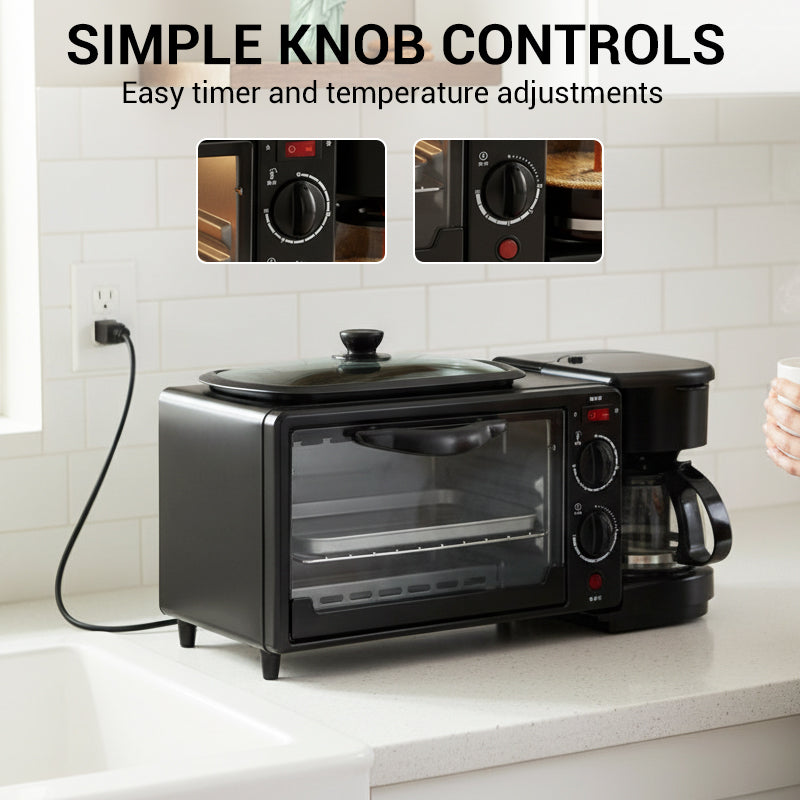 3-IN-1 BREAKFAST STATION - Streamline your morning routine by preparing your entire breakfast with one compact appliance. This unit combines a toaster oven, a coffee maker, and a griddle, saving valuable counter space and preparation time.