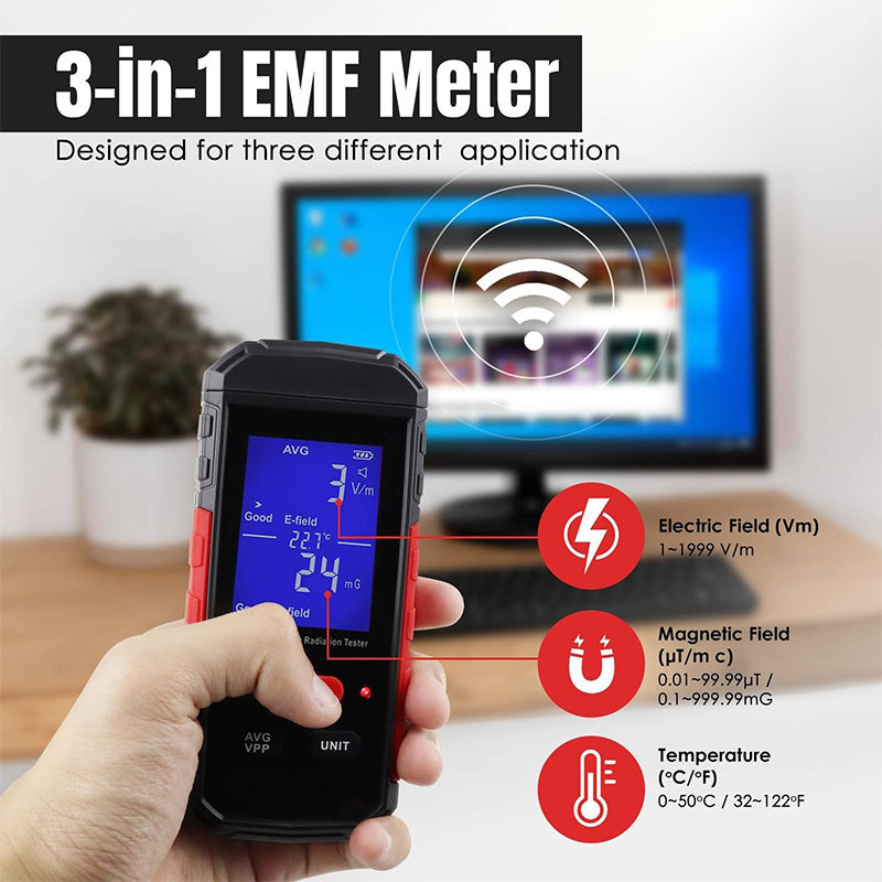 Safety Protection:This EMF detector can test electric field ranges from 1 to 1999V/m and magnetic field ranges from 0.01 to 99.99µT/0.1 to 999.9mG strength simultaneously. It also measures ambient temperature from 32℉ to 122℉. (Note: This EMF meter cannot test RF values.)