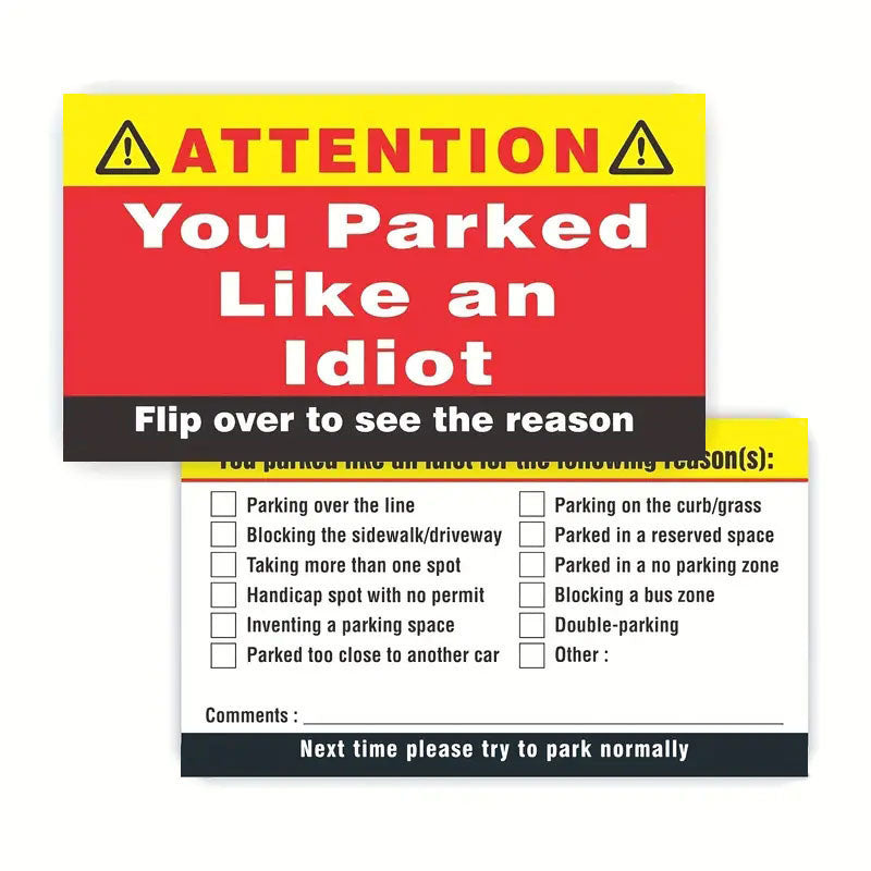 HUMOROUS YET EFFECTIVE MESSAGE: These cards feature a light-hearted, funny design on the front that gets the point across without being offensive. Perfect for letting someone know their parking skills need improvement—without any harsh confrontation. Keep it fun while still addressing the problem.